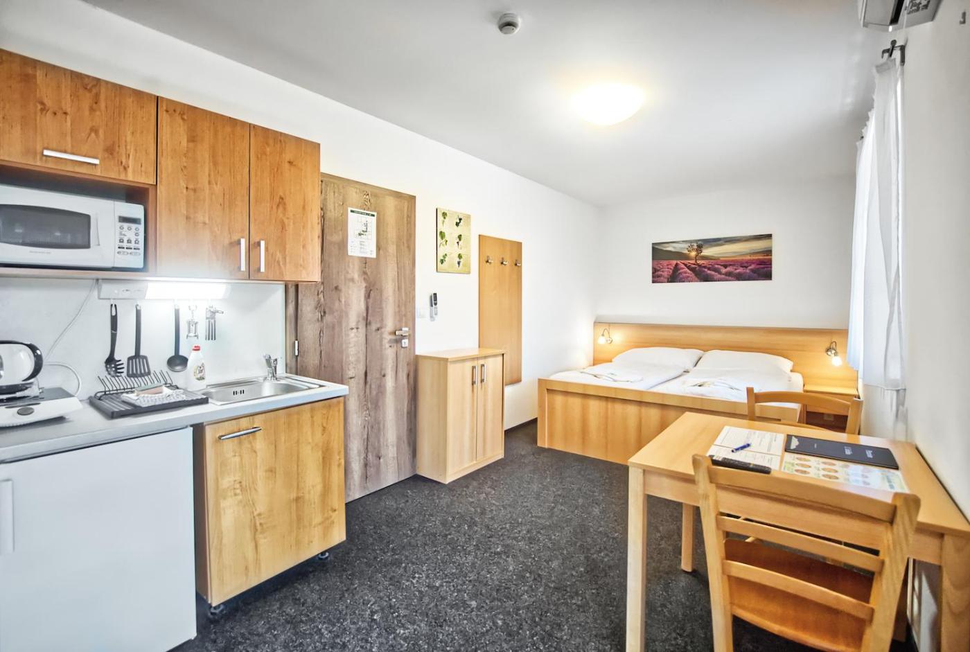 Dvoulůžkový pokoj s manželskou postelí. Toto studio má kuchyňský kout se sporákem a mikrovlnnou troubou a vlastní koupelnu se sprchou. ;